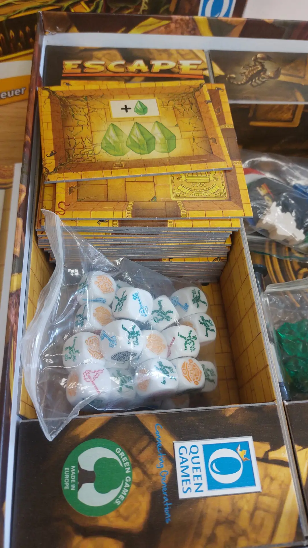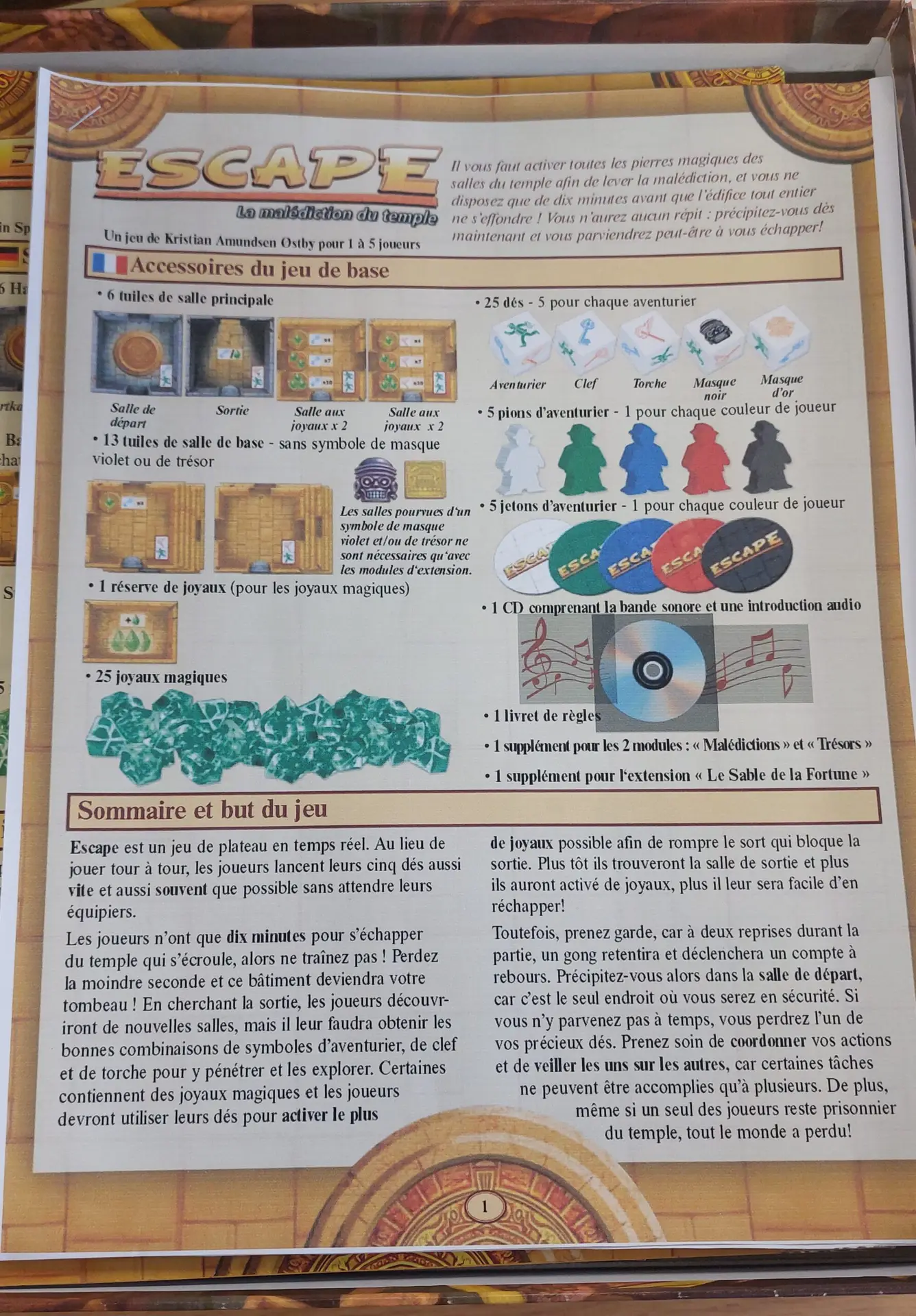 Escape – La Malédiction du Temple est un jeu coopératif en temps réel, où les joueurs lancent des dés simultanément pour explorer un temple et trouver la sortie avant l’effondrement. Porté par une bande sonore immersive, ce jeu propose une expérience intense, rapide et collective.
