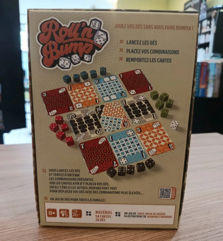 Roll N Bump est un jeu de collection de dés captivant où les joueurs lancent leurs dés à tour de rôle pour réaliser les combinaisons indiquées sur neuf cartes disposées sur la table. Stratégie et chance s’entremêlent alors que vous placez vos dés sur les cartes pour tenter de les revendiquer, tout en évitant que vos adversaires ne vous délogent. À la fin de la partie, comptez vos points de victoire ainsi que les points bonus pour les séries de cartes de différentes couleurs.