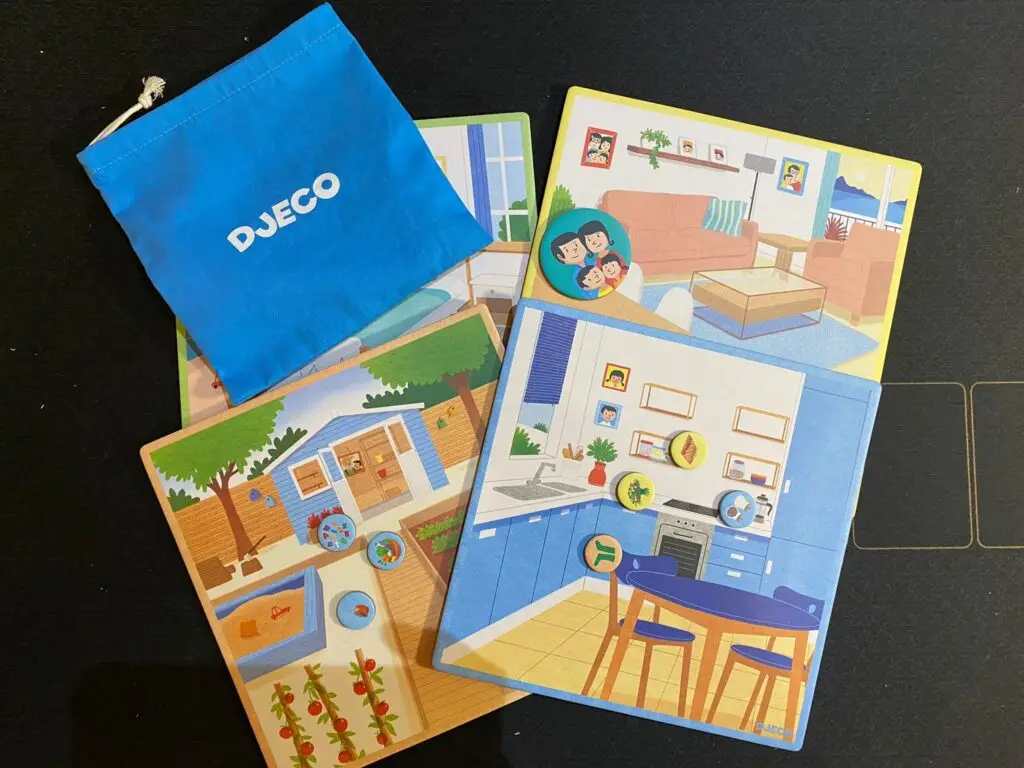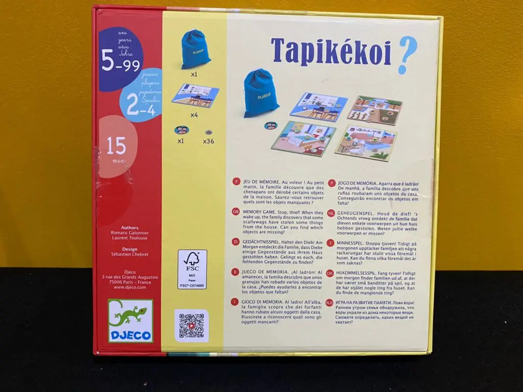 Découvrez le jeu Tapikékoi? de Djeco, un jeu de mémoire pour les enfants dès 5 ans où vous devrez aider une famille à retrouver les objets manquants dans la maison. Au voleur! De retour de ballade, la famille découvre qu’un chenapan a dérobé certains objets de la maison. Saurez vous aider la famille à retrouver quels sont les objets manquants. Un jeu éducatif sur les différences qui fera travailler la mémoire et le sens de l’observation des enfants.