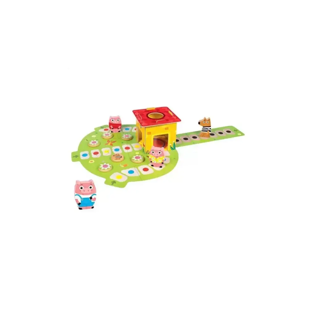 3 Little Pigs est un jeu coopératif pour les tout-petits, parfait comme premier jeu de société. Inspiré du célèbre conte, il propose une mécanique simple et colorée qui aide à reconnaître les couleurs et favorise la coopération. Les enfants incarnent les trois petits cochons et doivent rentrer dans la maison avant que le loup n’arrive !
