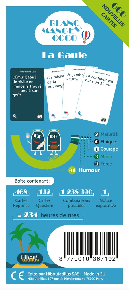Blanc Manger Coco – La Gaule se distingue par ses nombreuses cartes Questions et Réponses riches et variées. Le style de jeu laisse place à la créativité et à l’adaptation selon votre auditoire, en jouant sur l’absurde, l’inattendu ou le corrosif pour maximiser le plaisir et l’ambiance conviviale.