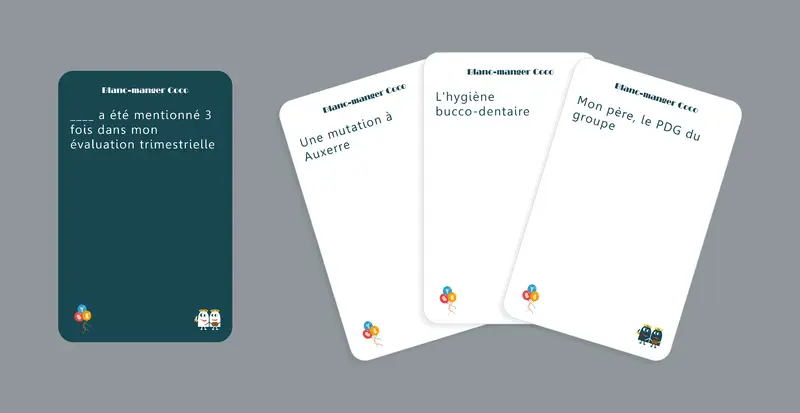 Le principe est simple et hilarant : un joueur lit une carte bleue contenant une phrase à trou, et les autres proposent la carte la plus drôle pour compléter la phrase. Résultat ? Des combinaisons absurdes et des fous rires garantis.