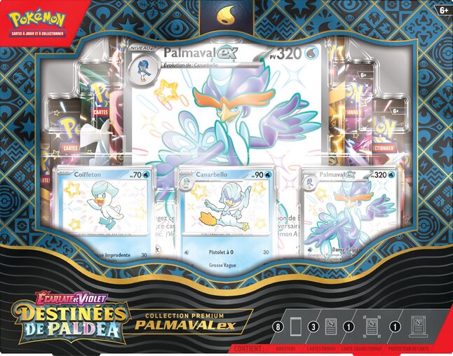 Avec le Coffret Collection Premium Palmaval-ex, explorez la magie des Pokémon chromatiques, renforcez vos decks avec des Pokémon-ex et découvrez l’extension Destinées de Paldea.