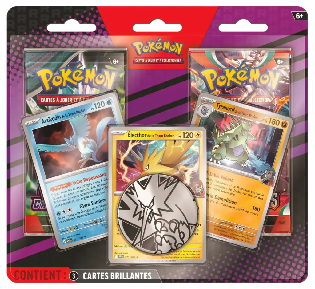 Duo Pack Team Rocket avec 2 boosters Écarlate & Violet (EV6 + EV3), 3 cartes holo cosmo exclusives (Artikodin, Électhor, Tyranocif) et une pièce Électhor. Compact, collector et parfait pour un plaisir d’ouverture immédiat.