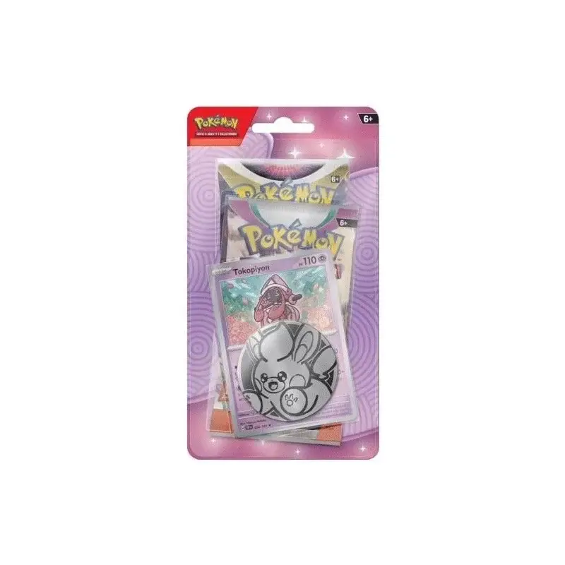 Le Pack Promo 2 Boosters Checklane Pokémon contient 2 boosters, une carte promo brillante exclusive de Tokopiyon, une pièce métallisée et une carte à code pour le JCC Pokémon Live. Idéal pour les collectionneurs et les joueurs souhaitant étoffer leur deck ou compléter leur collection.
