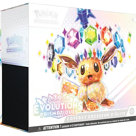 Ce coffret Dresseur d’Élite Pokémon EV 8.5 Évolutions Prismatiques contient 9 boosters, accessoires premium (protèges-cartes, dés, séparateurs) et une carte à code — parfait pour collectionner et jouer intensément.