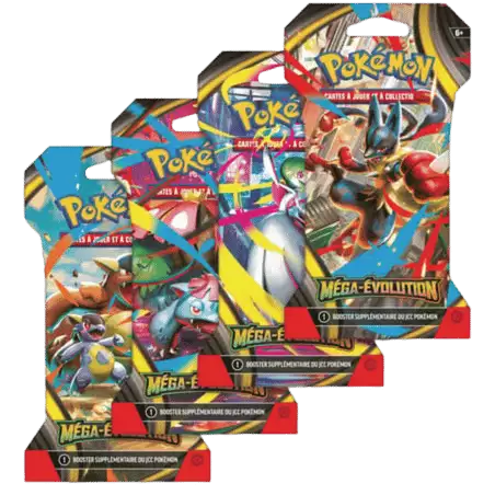 Blister de 3 boosters Pokémon Méga Évolution (édition française), parfait pour découvrir l’extension ou compléter ta collection avec des cartes rares et méga ex.