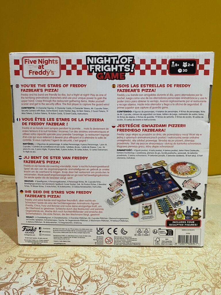 Five Nights at Freddy’s: Nights of Frights est un jeu de course simple et rapide où chaque décision compte. Sa mécanique de pose de jetons, la gestion des actions et l’interaction avec le gardien créent une atmosphère tendue et captivante. Les figurines peintes et le thème horrifique issu du célèbre univers apportent une immersion supplémentaire unique.