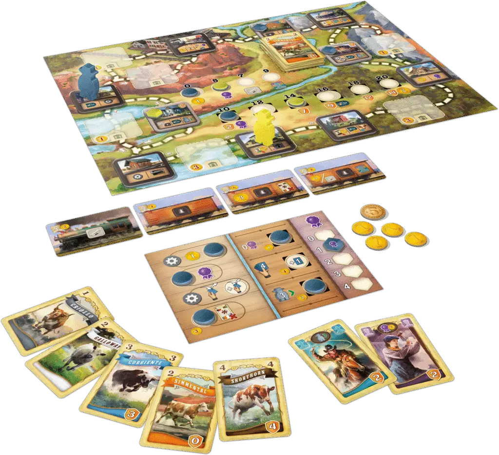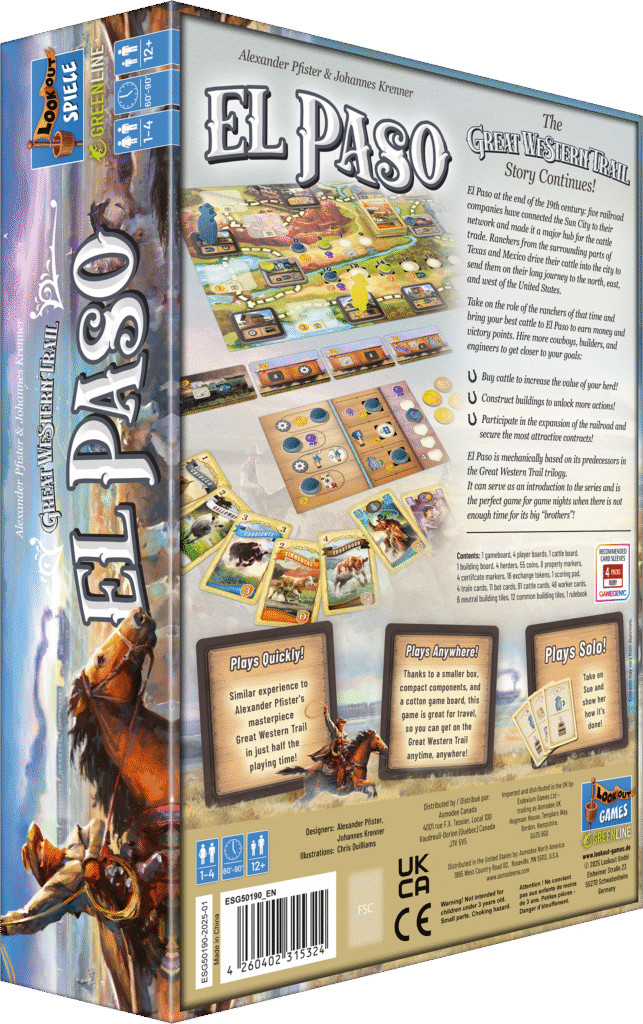 Bienvenue à El Paso, fin XIXe siècle : carrefour du commerce du bétail, relié par cinq grandes compagnies ferroviaires. Incarnez un éleveur ambitieux et menez votre troupeau texan ou mexicain jusqu’à El Paso pour engranger des dollars et des points de victoire !