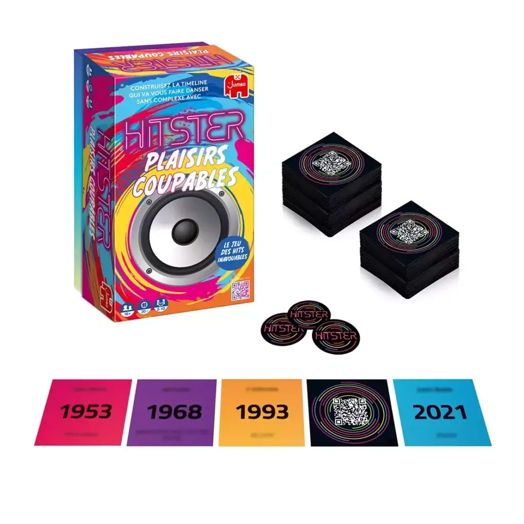 Plongez dans l’univers musical avec cette édition Plaisirs Coupables de Hitster, un jeu autonome qui vous invite à remonter le temps à travers plus de 100 ans de tubes incontournables. Votre mission est de placer correctement les chansons préférées sur votre ligne du temps musicale pour remporter la partie.