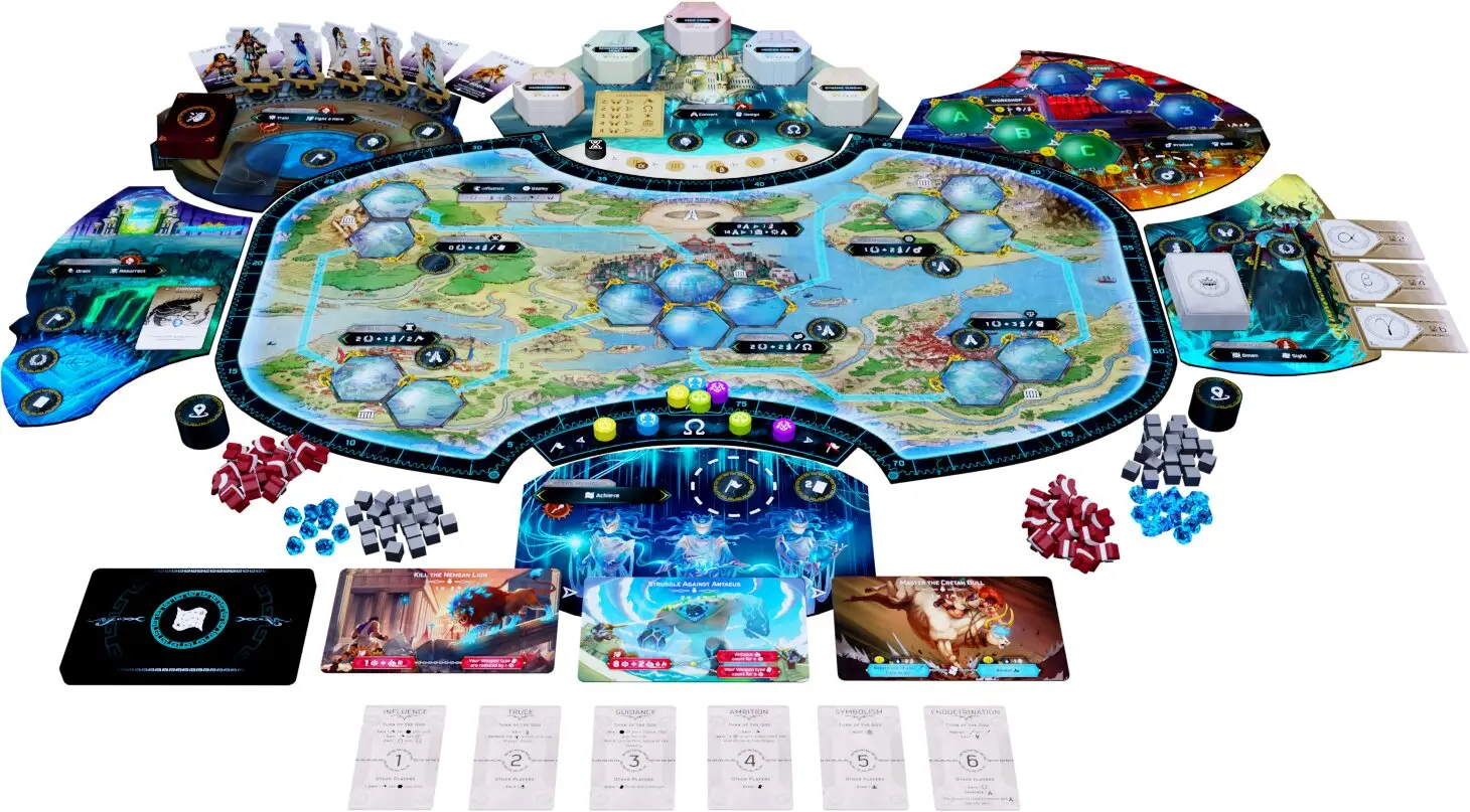 Durant une session de jeu de 120 minutes minimum, les joueurs incarnent un Olympien en quête de domination. Utilisez l’Eegis pour satisfaire les attentes des grandes cités grecques, déverrouillez des améliorations divines et engagez des combats héroïques pour accroître votre puissance. Le but ultime ? Accumuler des points de victoire ou activer toutes vos capacités divines avant la fin du 6e âge.