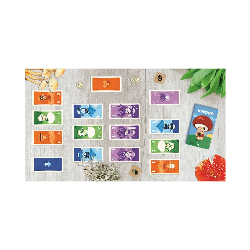Plongez dans l’univers enchanteur de Kinoko 🍄, le jeu de société qui vous entraîne dans une aventure ludique et stratégique de cueillette de champignons. Chaque joueur tire secrètement une carte de couleur correspondant à une famille de champignons (musiciens, scientifiques, etc.) et reçoit une main de 3 cartes champignons. À votre tour, lancez les 3 dés 🎲 et choisissez-en un, dont le résultat (chiffre ou icône) détermine votre action : échanger deux cartes, échanger deux séries de cartes, piocher secrètement une carte, etc. Pour gagner le tour, soyez le premier à réunir les 3 membres de votre famille, que ce soit dans la main d’un adversaire ou sur la table, et marquez des points. Mais attention, à chaque tour, une famille se révèle toxique ⚠️ : détenir une carte de cette couleur vous pénalisera d’un point négatif. Vos décisions, guidées par le hasard des dés, feront toute la différence entre victoire et défaite !