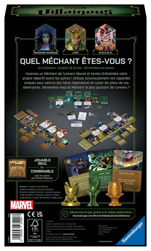 Cette extension de Marvel Villainous vous permet d’incarner trois nouveaux ennemis emblématiques de l’univers Marvel, chacun avec son propre plan diabolique à accomplir :