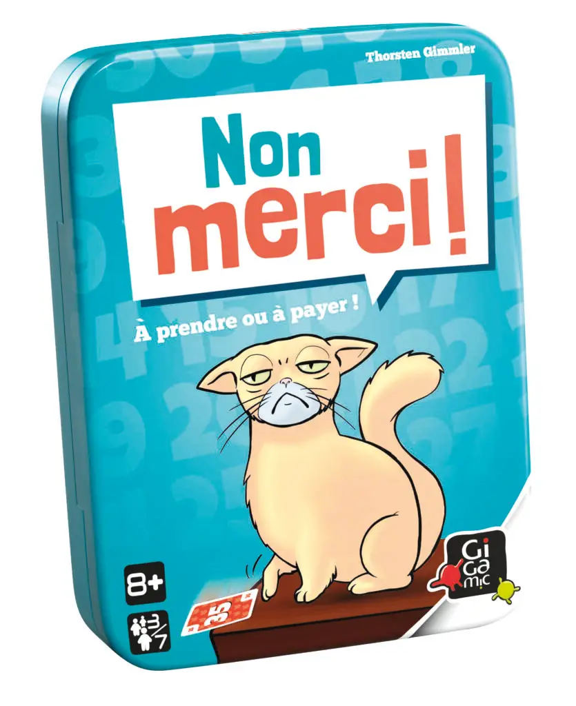 Non Merci est un jeu subtil qui demande réflexion et stratégie. À chaque tour, vous devrez choisir entre accepter une carte ou dire « Non merci ! » en posant un de vos jetons sur la carte refusée. Le joueur suivant prendra alors une décision, et pourrait même récupérer votre jeton.
