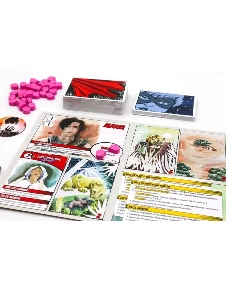 Créez l’histoire d’un super-héros en remportant des plis et en construisant des tableaux. Affrontez vos adversaires en 5 manches pour révéler et façonner votre origine héroïque.
