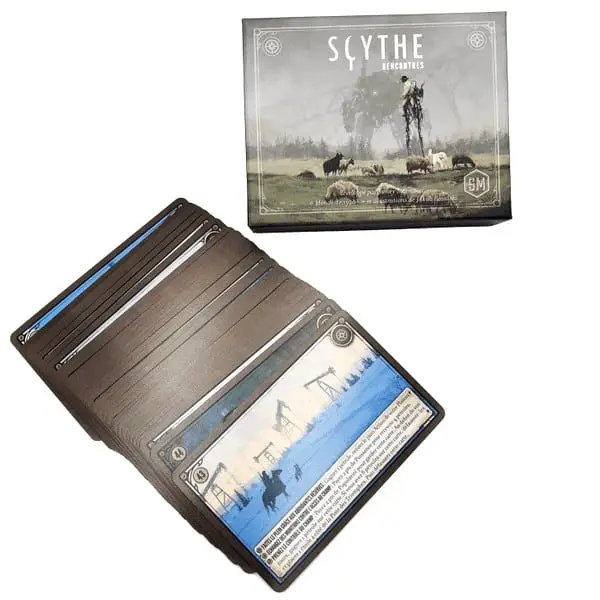 Dans Scythe – Rencontres, 32 cartes uniques ont été créées par la communauté de fans du monde entier. Ces cartes apportent de nouvelles aventures et défis dans l’univers de Scythe, en introduisant des scénarios originaux à vivre à chaque partie. Sélectionnées, affinées et arrangées par Jamey Stegmaier, elles peuvent être mélangées avec les cartes Rencontre classiques pour diversifier vos expériences de jeu.
