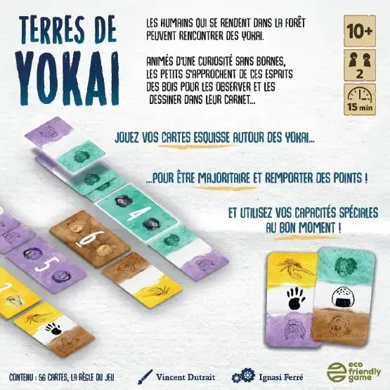 Dans ce jeu à 2 joueurs, plongez dans l’univers fascinant des Yokais, ces esprits de la nature. Observez-les dans leur habitat et réalisez les meilleurs croquis pour marquer des points. En jouant stratégiquement vos cartes, vous devez prendre soin de devenir majoritaire autour des Yokais pour dominer la partie. Chaque mouvement compte, et seule une observation précise et une planification habile vous permettront de l’emporter.