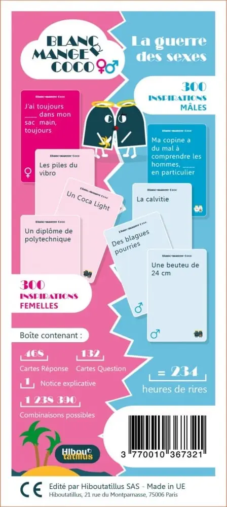 Blanc Manger Coco – La Guerre des sexes est un jeu d’ambiance humoristique où les joueurs complètent des phrases à trou avec des cartes pour créer des combinaisons drôles et détonantes. Parfait pour l’apéro, ce jeu explore les stéréotypes des univers masculins et féminins pour des moments de rire garantis.
