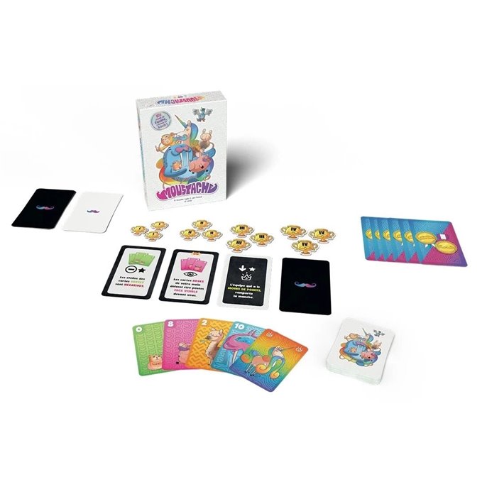 Dans Moustache, oubliez les automatismes : les équipes changent à chaque tour et de nouvelles règles viennent pimenter la partie à chaque manche. Inversion de la hiérarchie des couleurs, jokers déjantés, effets surprenants… Rien n’est jamais figé, et tout peut basculer !